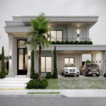 Área de lazer ampla, com churrasqueira, bancada, piscina, espaço para tv e paisagismo.